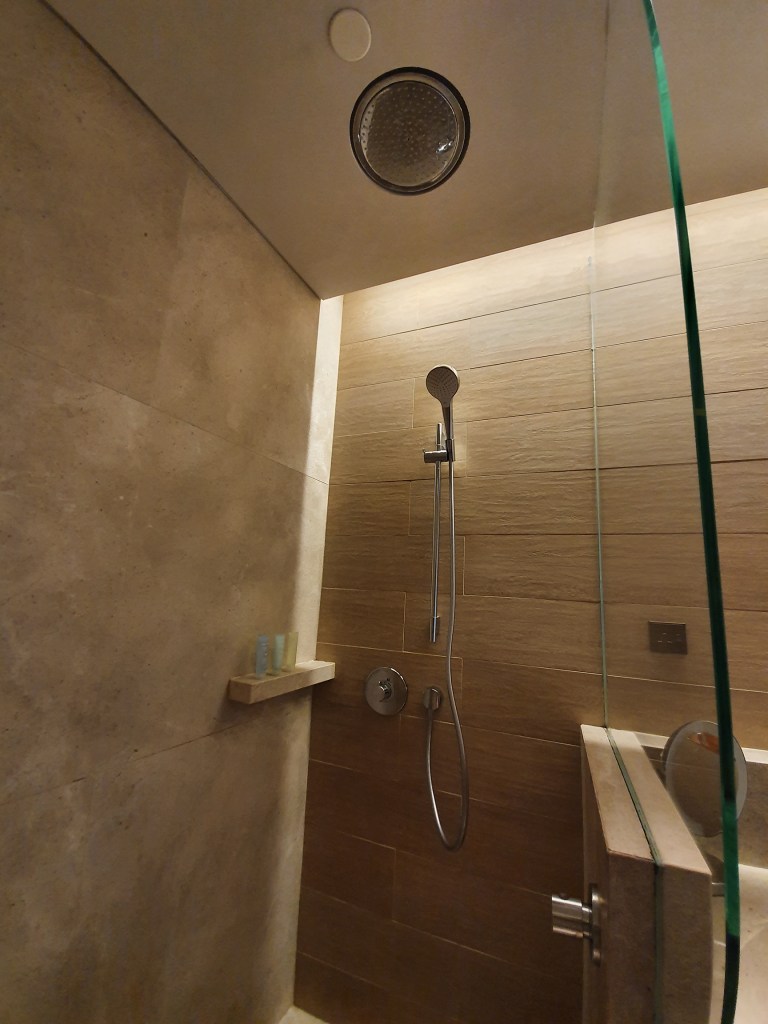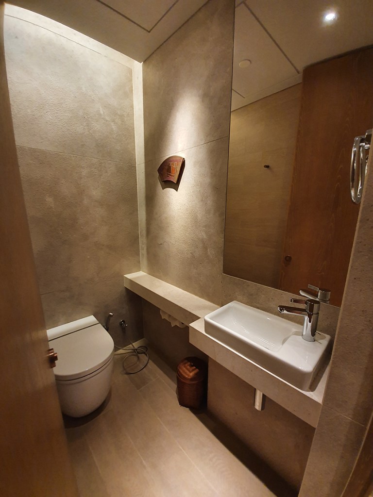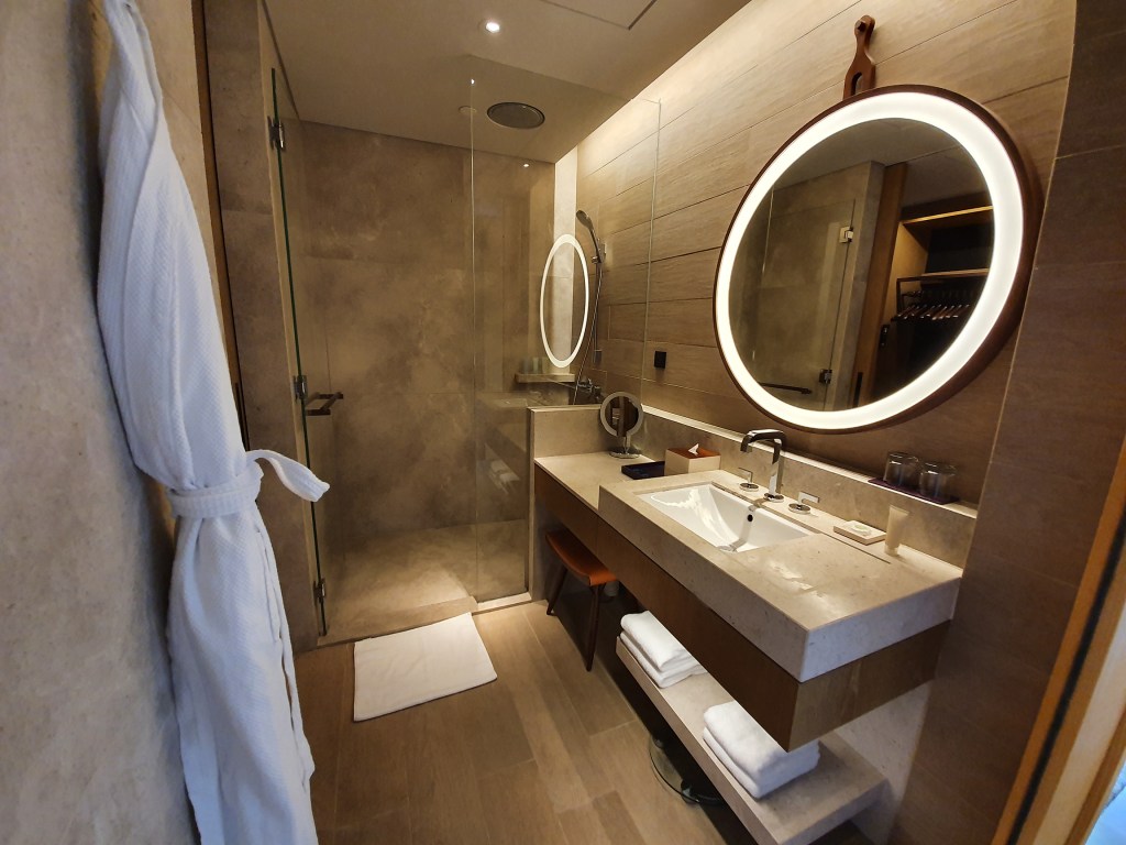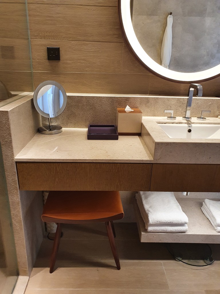 At the vanity area is the washbasin, and plenty of table space for all your make-up and skincare products to go on. There’s even a seat provided so that anyone can take their time to comfortably put on their make-up there, in front of the close-up mirror provided. A drawer can also be found here, and in it are the hair-dryer and bathroom amenities.
