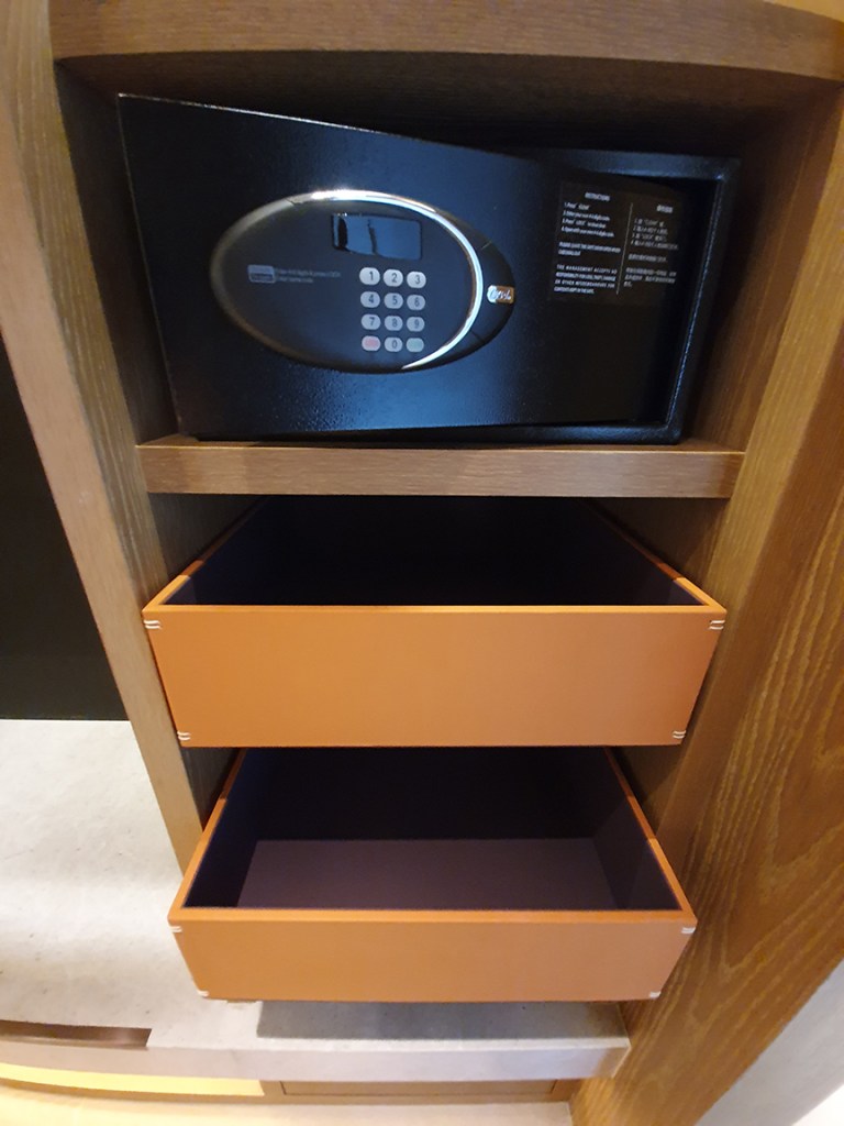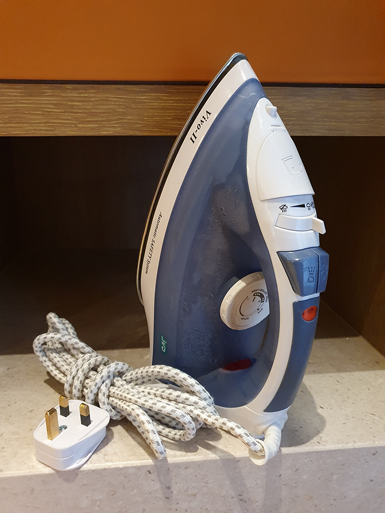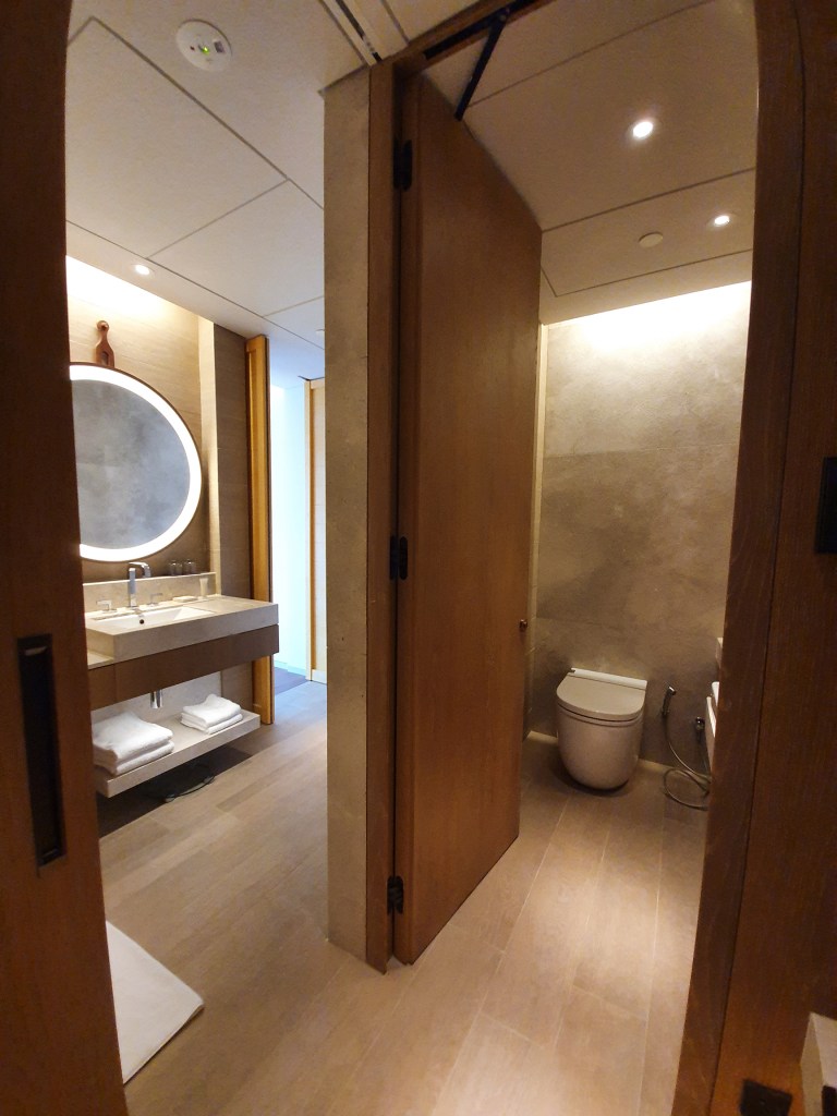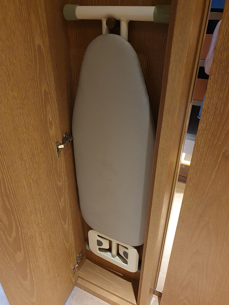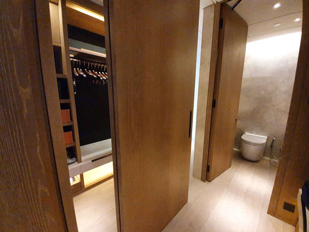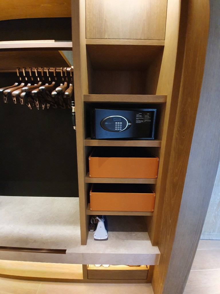 Right outside the toilet is the walk-in closet. Basically it’s an open space with a full length mirror (hidden behind the sliding door to the shower/vanity area, an area to hang clothes or place bags, and there are also plenty of spaces for storage at the side, which is also where you can find the safe deposit box. Plenty of hangers are provided, and there is also an iron that you can find here. The ironing board is stored next to the full length mirror – it’s hidden in a flat cupboard facing the storage area where you can find the iron at.