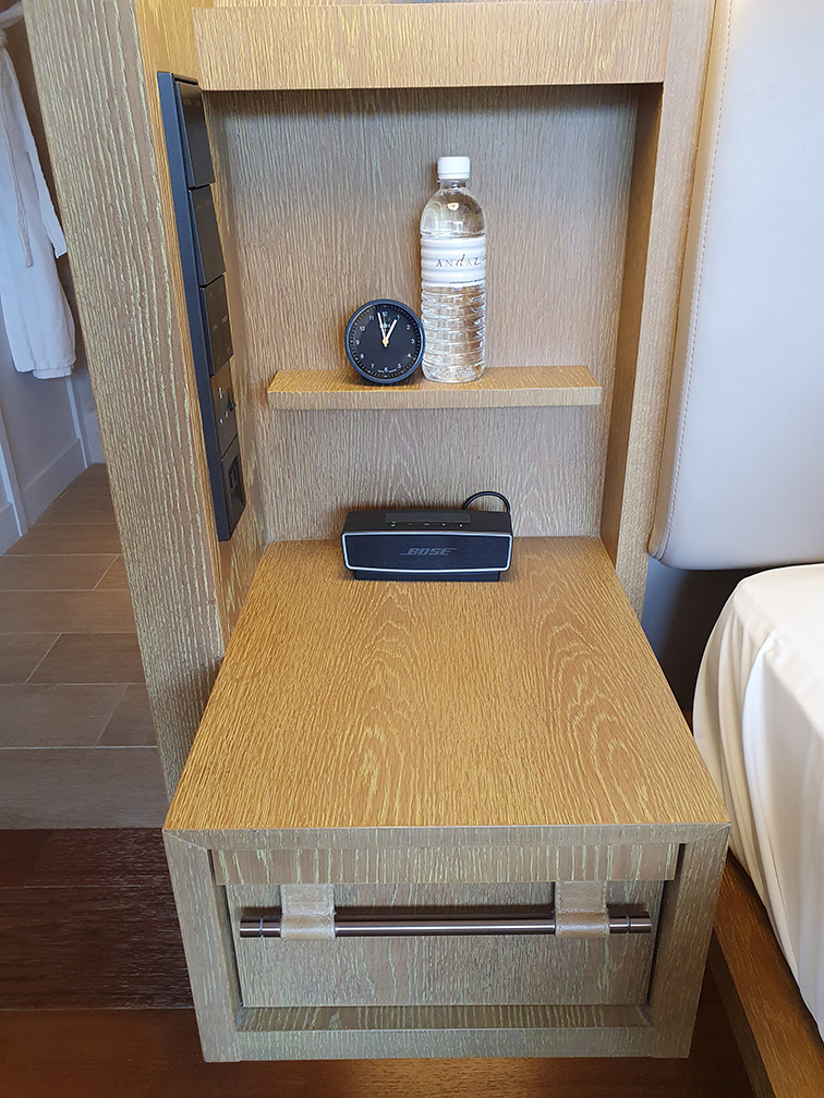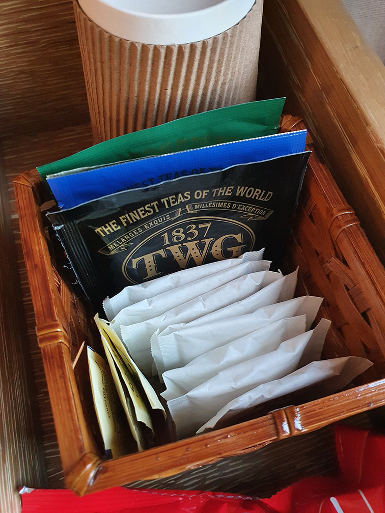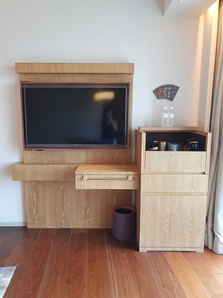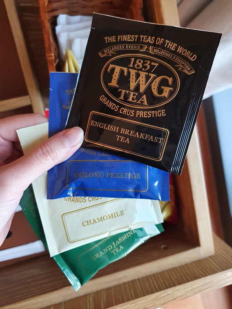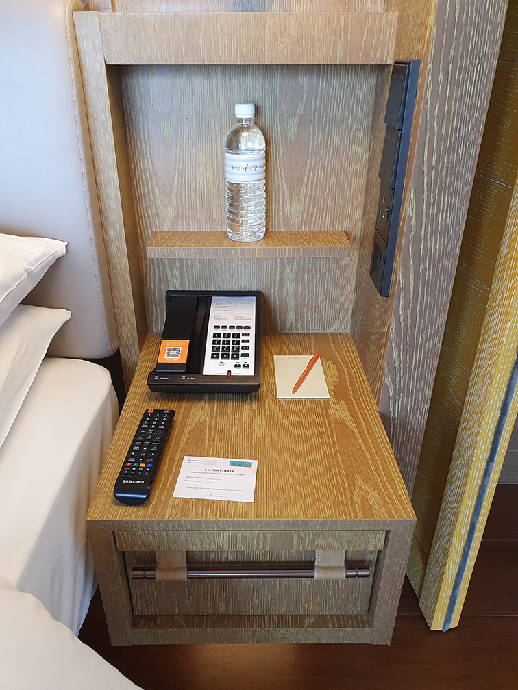 The coffee and tea making corner has a Nespresso machine, teapot and electric kettle. The minibar is in the lowest drawer, and we had access to one free round of the minibar stock. In total, there are 4 complimentary bottles of water – 2 at the coffee and tea making corner, and 1 each at either sides of the bed (on the bedside table).