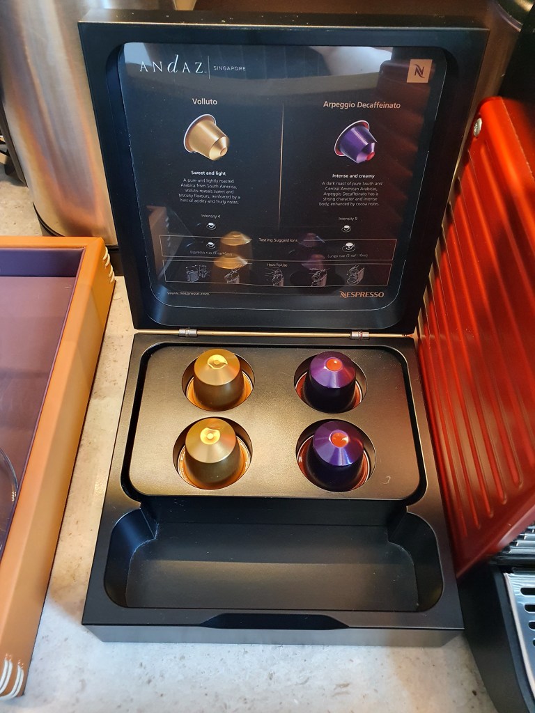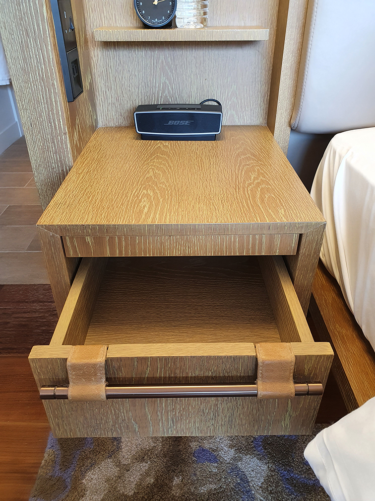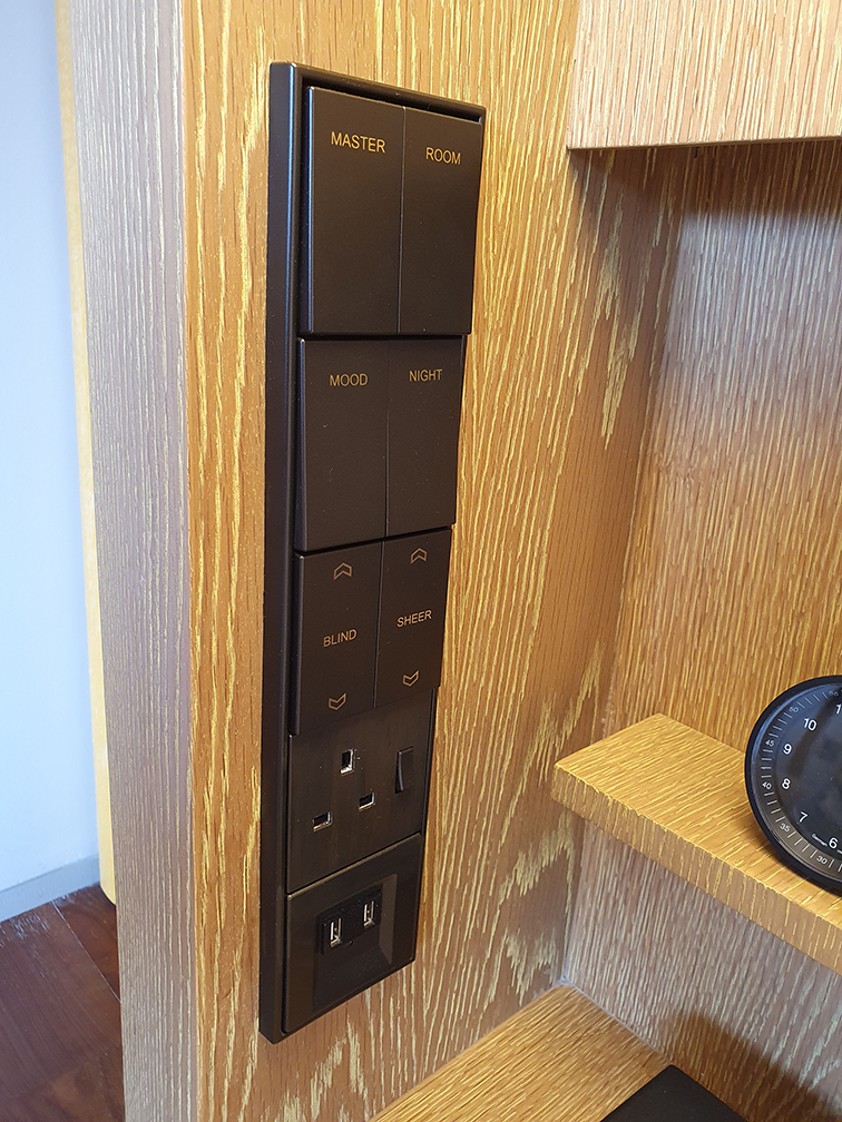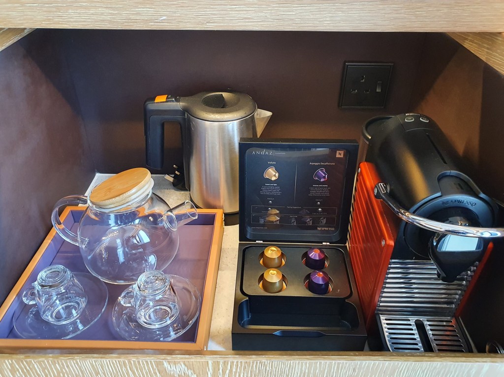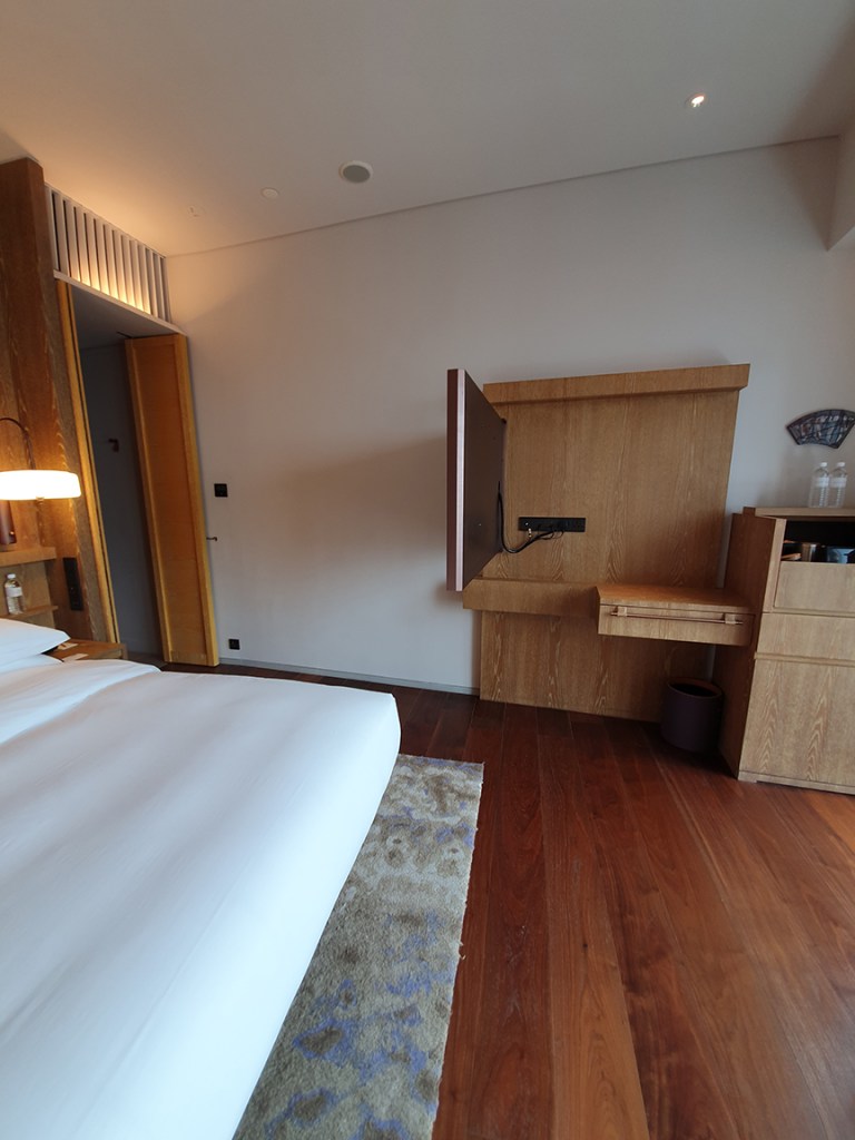 The coffee and tea making corner has a Nespresso machine, teapot and electric kettle. The minibar is in the lowest drawer, and we had access to one free round of the minibar stock. In total, there are 4 complimentary bottles of water – 2 at the coffee and tea making corner, and 1 each at either sides of the bed (on the bedside table).