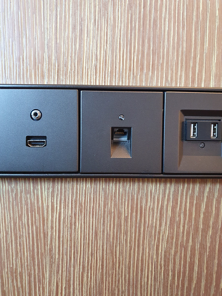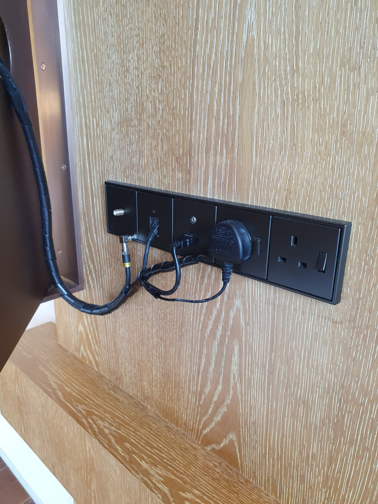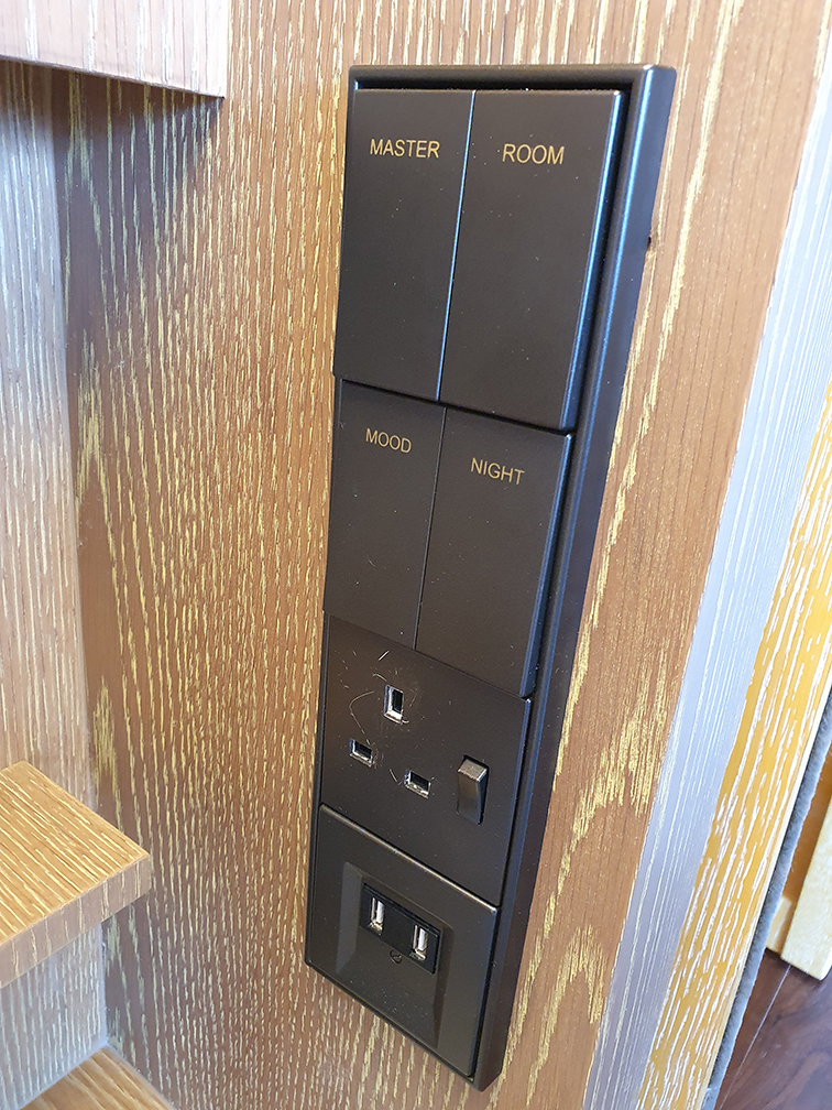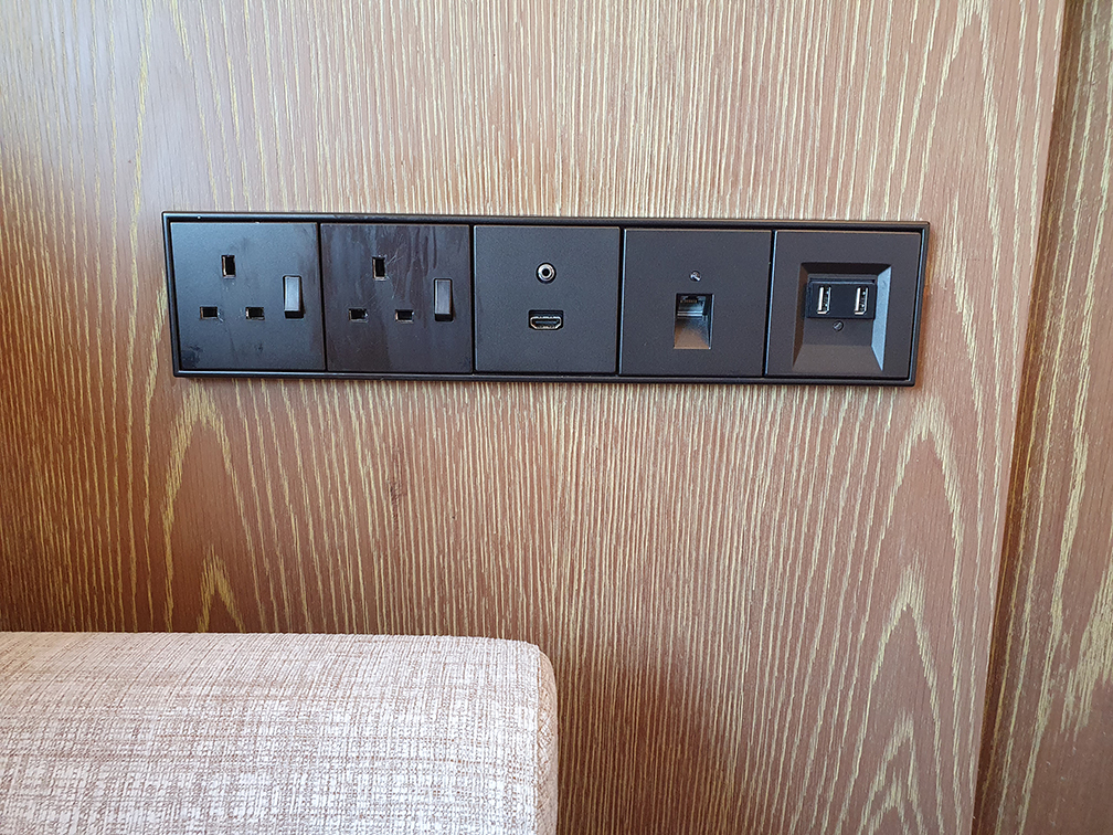 There’s a sofa that is good for 3 (or someone could even sleep on it) with plenty of plush cushions. Next to the sofa (and table) are some wall plugs – one thing to note though: the USB plug charges at a pretty slow speed.