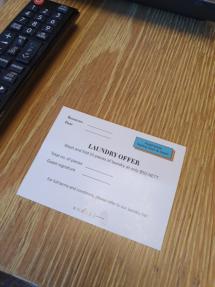Side note: the bedroom slippers provided are the old-school slippers that many of us Singaporeans remember that we can buy from shops in the heartland areas 😀 The unique twist is that they have “Stolen from Andaz” on it 🙈 – another nod to a very Singaporean-y behavior to “kope” free stuff from hotels and whatnot HAHAHA. Anyway there were 2 pairs provided – one in size M and another in size L 😀