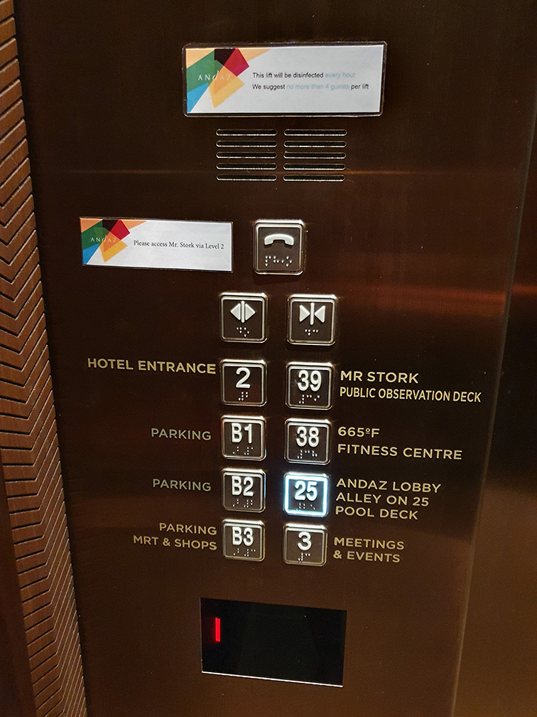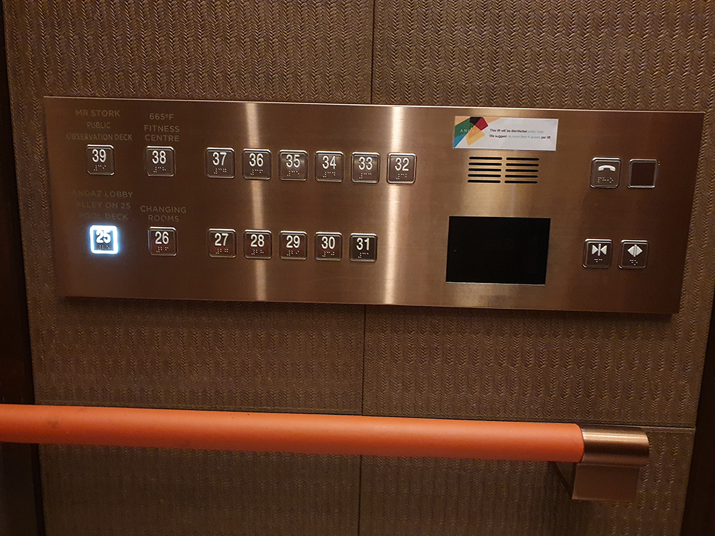 To get to the guest rooms, you will need to take the lift from Level 2 (Hotel Entrance) to Level 25 (Andaz Lobby), then change to the adjacent lift lobby to access Levels 26 and up to Level 39.
