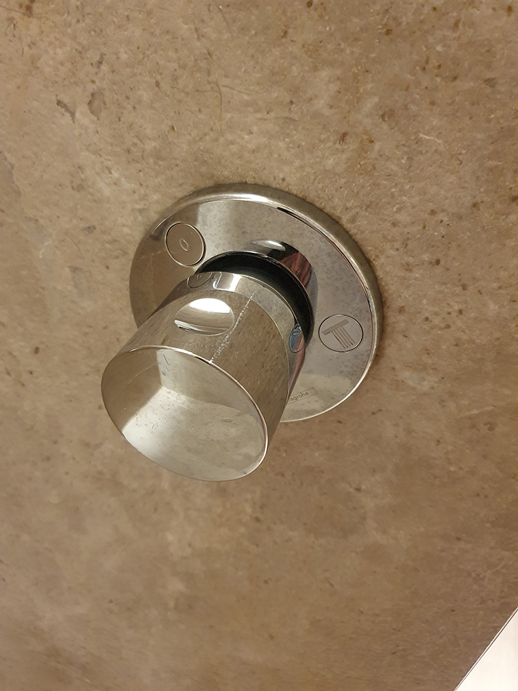 The shower stall comes with a handheld shower and rain shower, both controllable from the same knob – as you turn it, it can activate either only the handheld showerhead, only the rain shower, or both at the same time. A Velcro strip is also stuck on one side of the knob – a pretty clever trick to allow users to turn the knock despite having soapy hands.