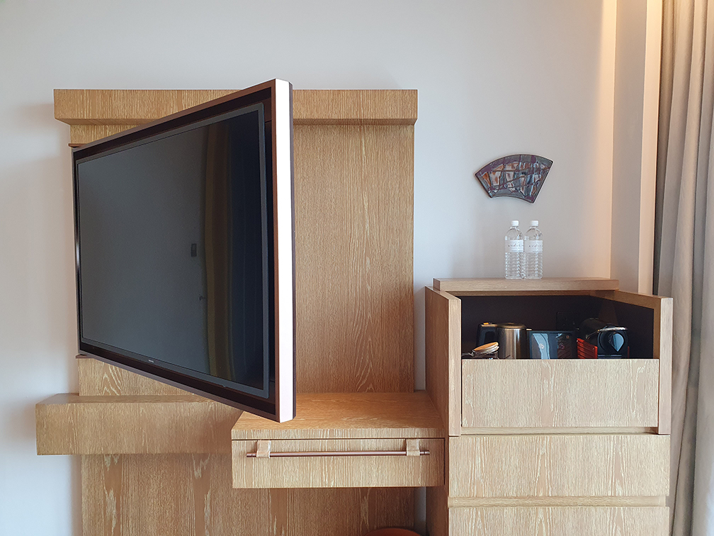 Cable TV is available, and the TV can be swiveled out to angle the TV to be nicely visible from the bed as well (since it’s originally facing the table/sofa area). You can turn it to 90degrees as well (or even more, I guess :P)