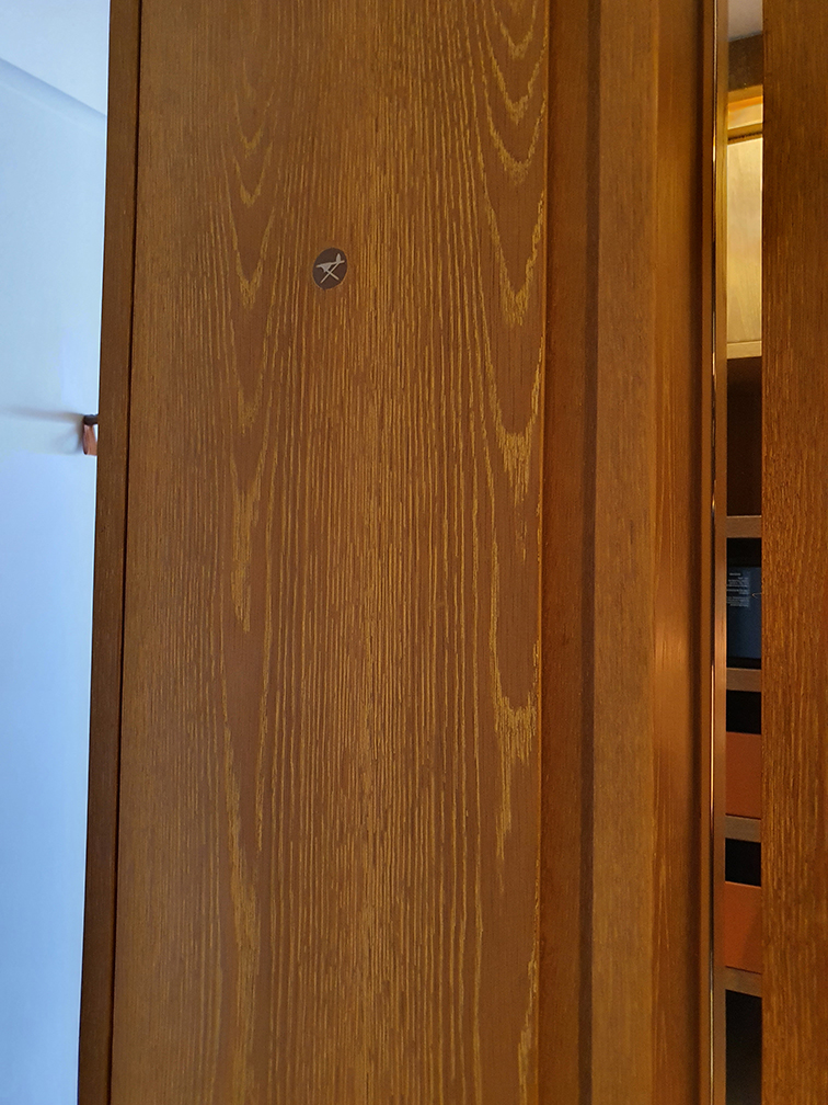 The ironing board is stored on the left in this photo. Then there’s the full length mirror, which is behind this sliding door that leads to the vanity/shower area.