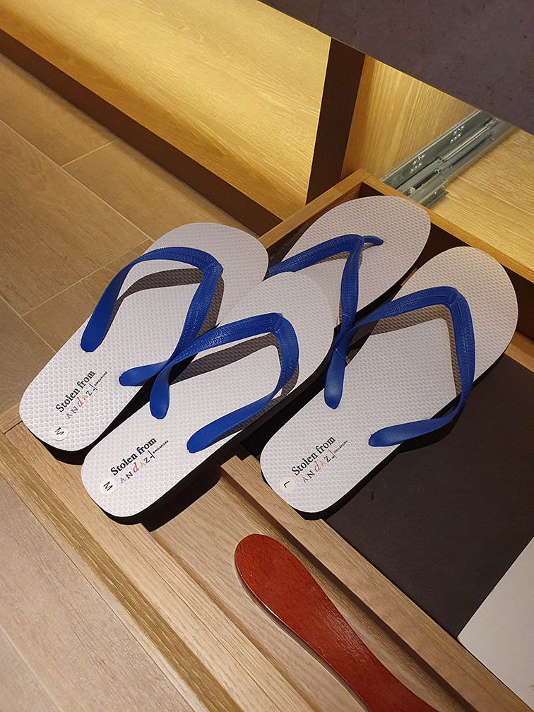 Side note: the bedroom slippers provided are the old-school slippers that many of us Singaporeans remember that we can buy from shops in the heartland areas 😀 The unique twist is that they have “Stolen from Andaz” on it 🙈 – another nod to a very Singaporean-y behavior to “kope” free stuff from hotels and whatnot HAHAHA. Anyway there were 2 pairs provided – one in size M and another in size L 😀