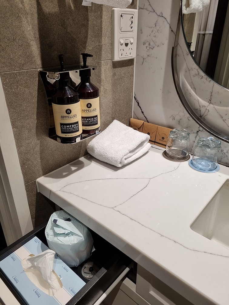 No dental kit was provided, but there was a vanity kit, shower cap and sanitary bag. A spare box of tissues and a spare roll of toilet paper can be found in the drawer of the vanity sink.