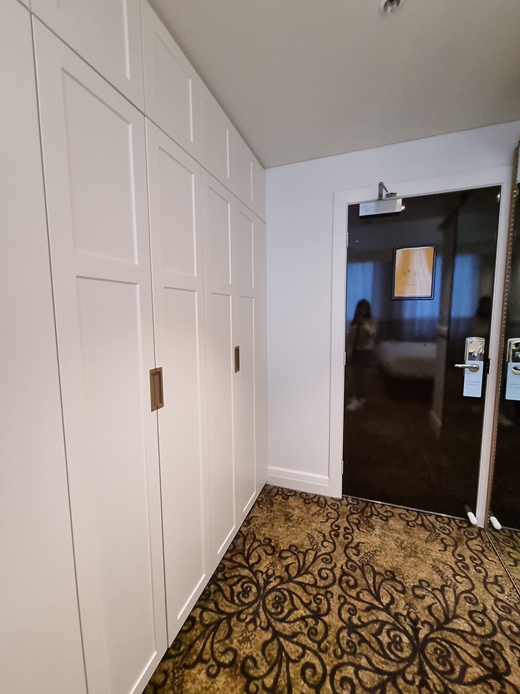 The room is spacious – so much so that I could have a special corner on the floor for my 24” luggage, and still leave the ironing board set up next to it, with plenty of room to walk around.