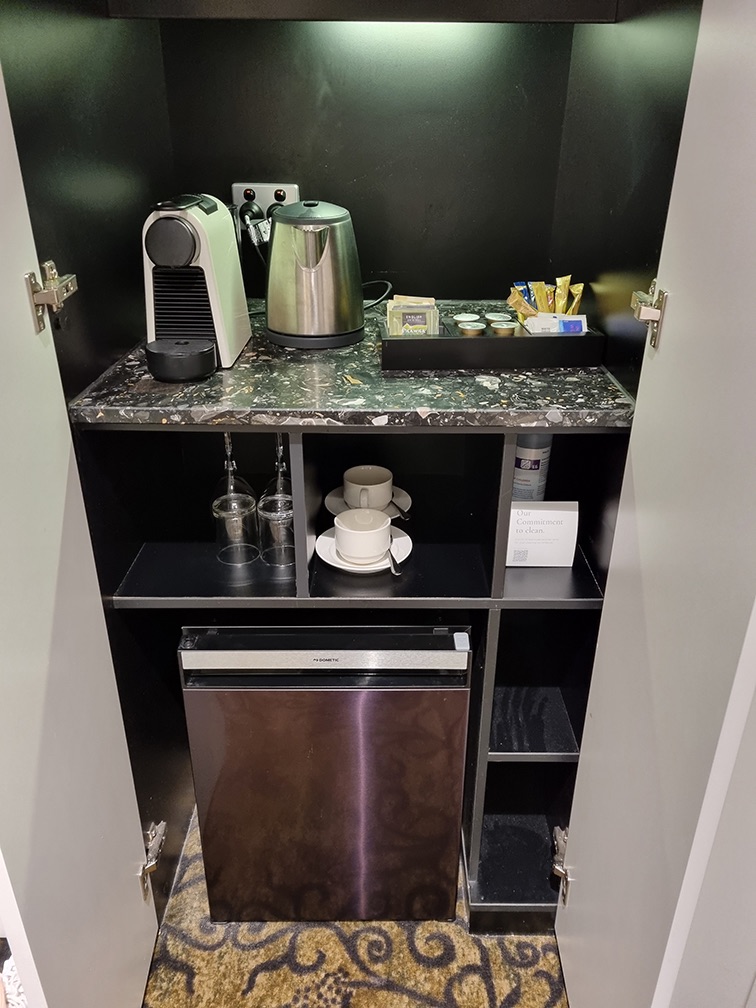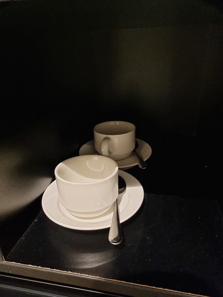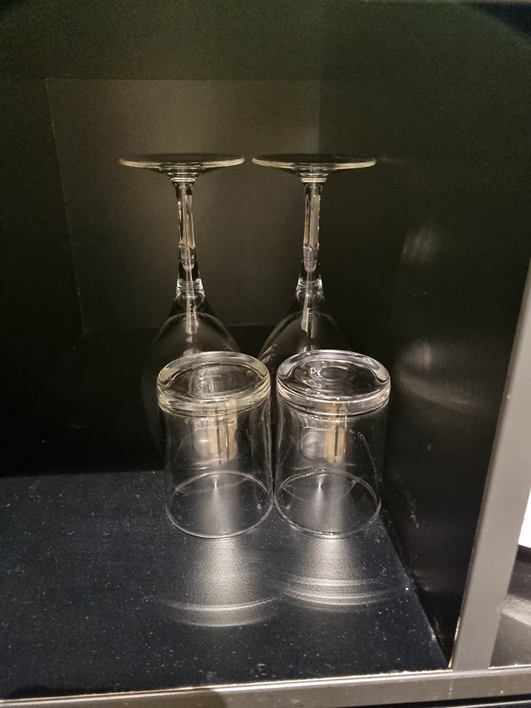 There is also a coffee and tea corner, with wine glasses, normal glasses, and teacups. An electric kettle is provided as well.