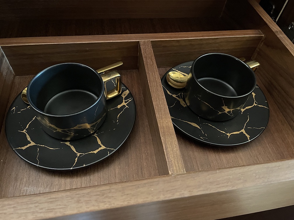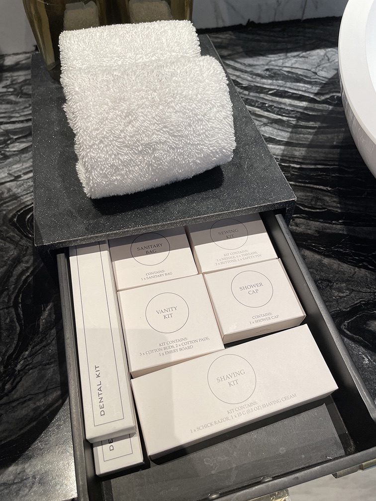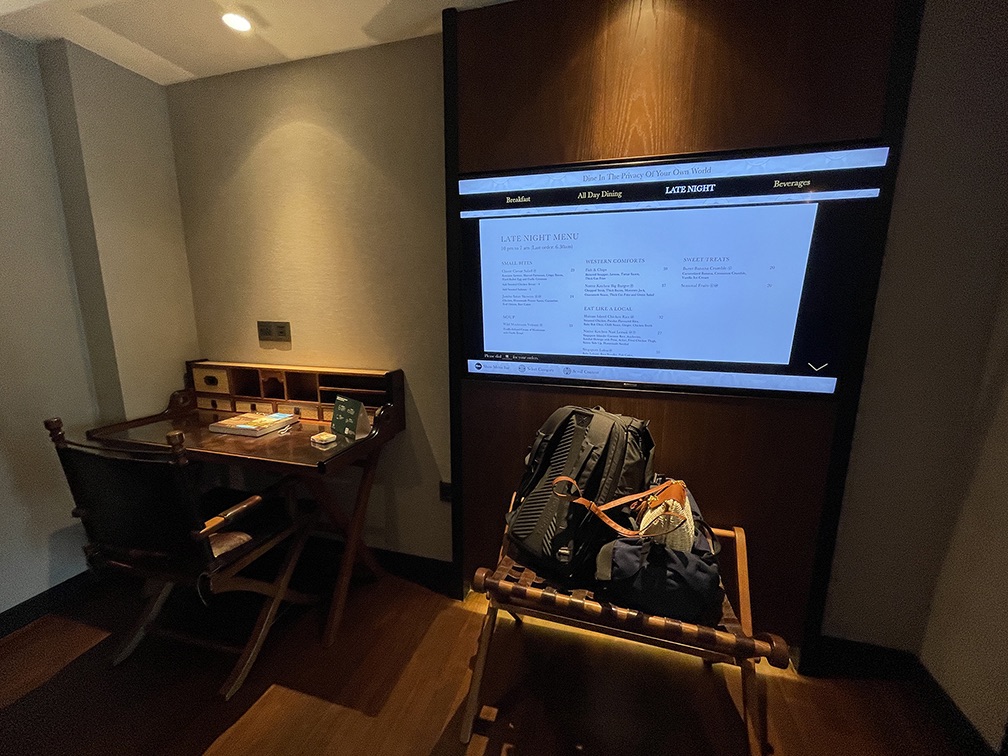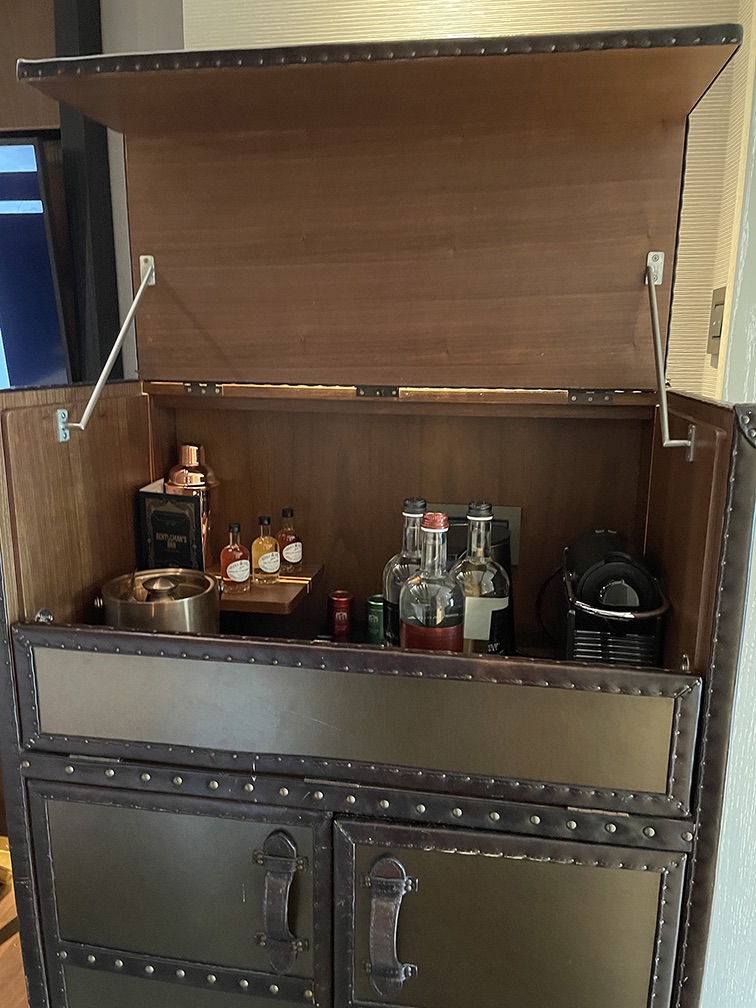 The coffee area sits atop a chest – at the bottom is the minibar, and on top sits the Nespresso machine with 4 capsules provided, an ice bucket, glasses, some small bottles of alcohol, bottles of tea leaves, and drinking water stored in glass bottles. The minibar had ginger ale, tonic water, and Coca Cola. For those of you new to such a layout, the front rectangular portion of the top area can be pulled down into an extended table top area and provides easier access to the Nespresso machine and the other drinks.