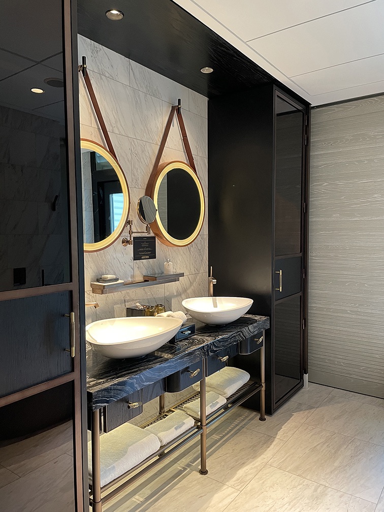 There are 2 sinks, with a small closet at each end of the vanity sink. In either closets you can find the bathrobes, bathroom slippers, ironing board & iron set, hairdryer (in a pouch), hangers, an umbrella, and the safe.