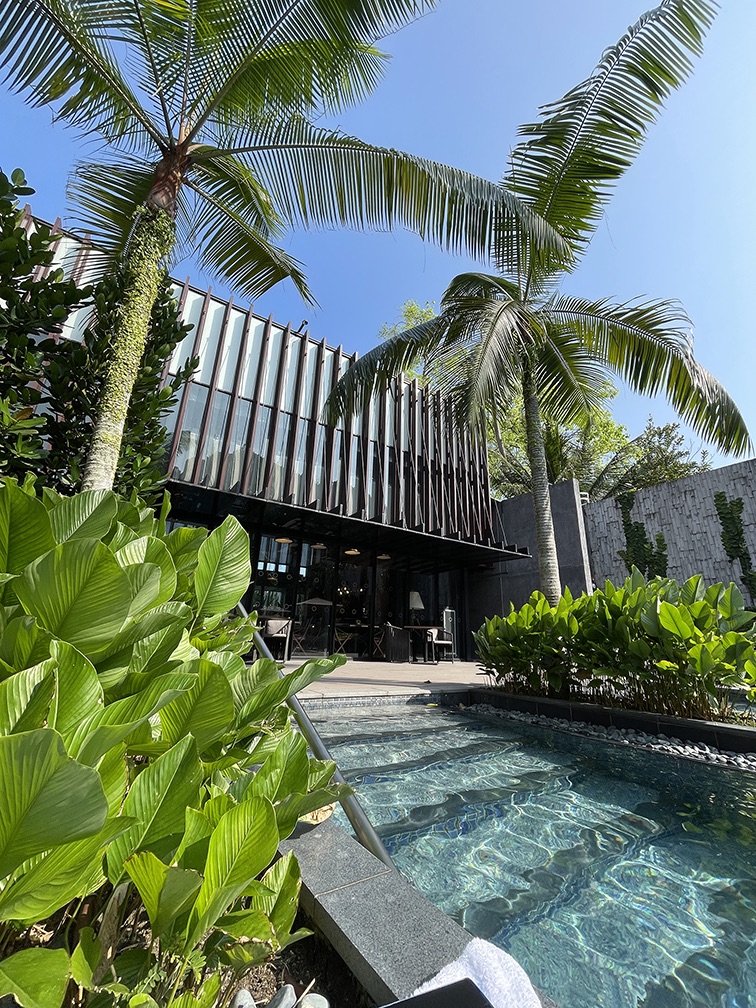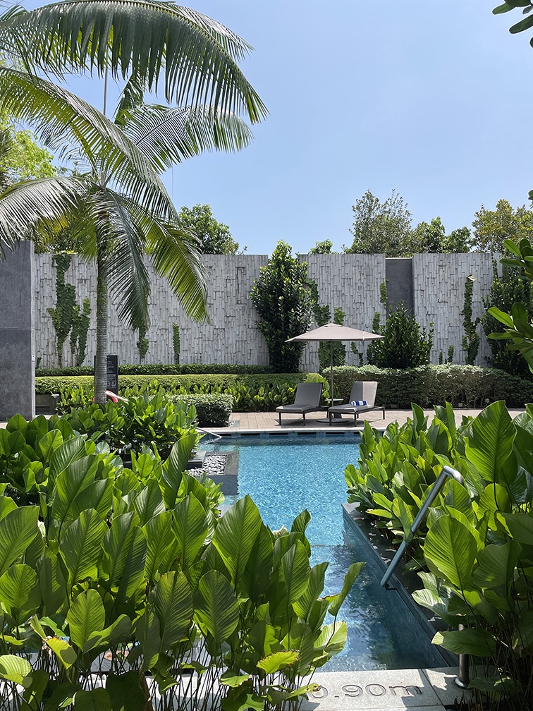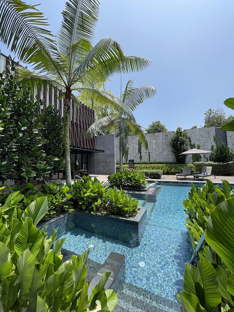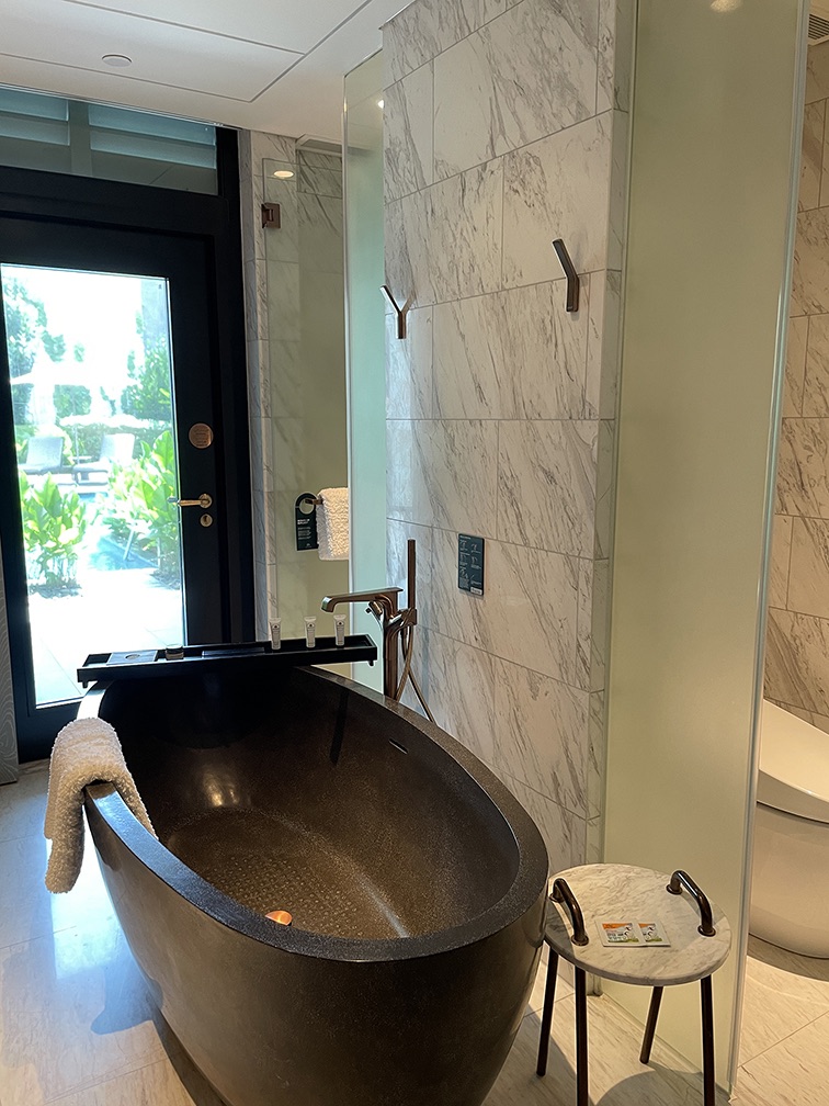 We stayed in the Premier Room with Pool Access. The room has a bit of an Old World charm mixed in with modern luxury, and comes with a king-sized bed, study desk, coffee-and-tea-making area, and a spacious bathroom that has a door leading to the pool-access area. In the pool-access area, there’s a sofa and table to lounge at. We were pretty lucky to get the corner room, so our end of the pool had a cozy private corner for the jacuzzi!