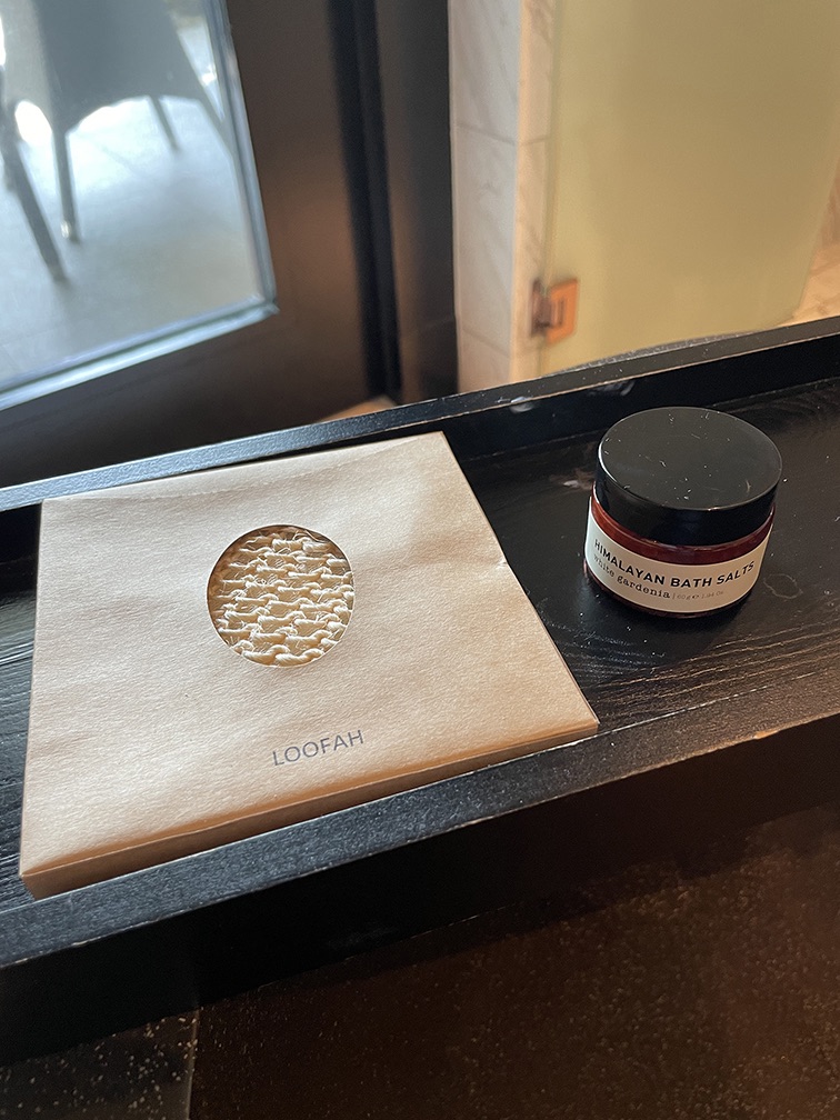 The water pressure from the tap is great and fills up the tub really quickly! On the bathtub tray, there are a few bottles of soap, a loofah, and a tub of Himalayan bath salts. The neat part: there’s also a phone stand! So you can rest your phone on it and watch your K-Drama or YouTube while enjoying your soak.