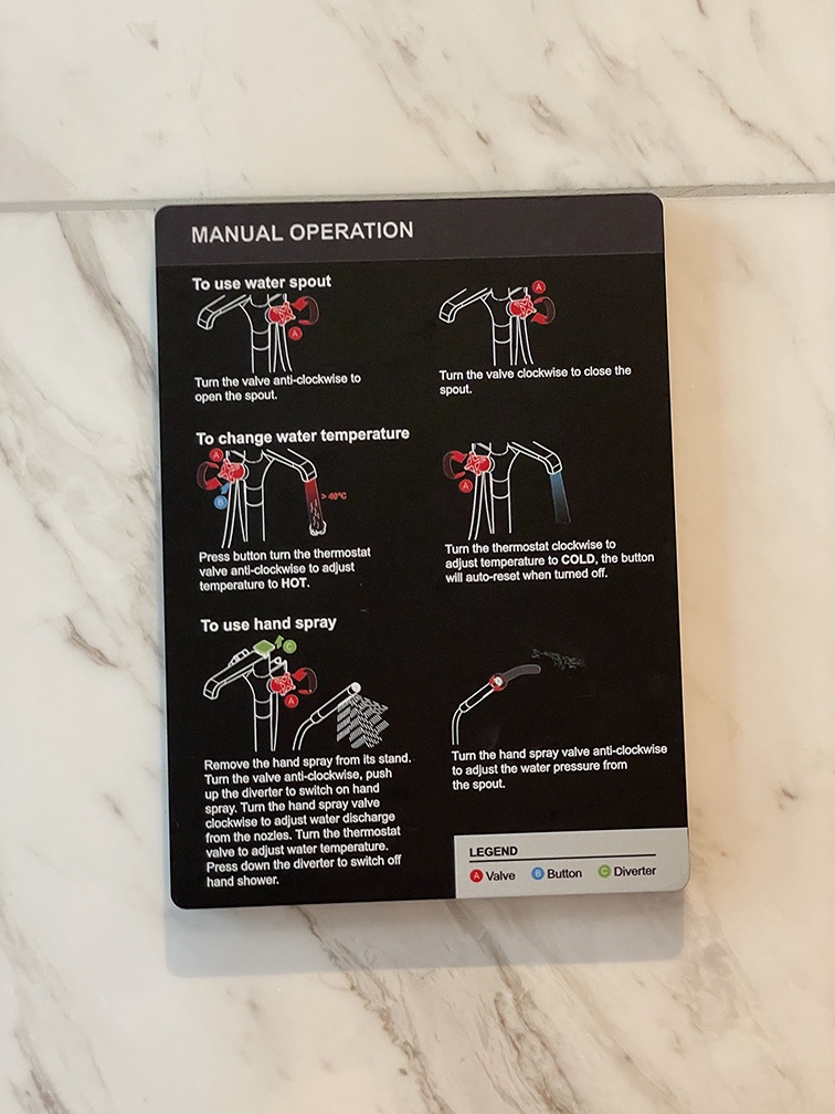 The bathroom is spacious, and has a shower area separate from the bathtub area (it’s a stone tub!), and a separate area where the Japanese toilet bowl is (with buttons on the side!). The shower area has a hand-held shower and rain shower, while the bathtub comes with a handheld shower and tap.