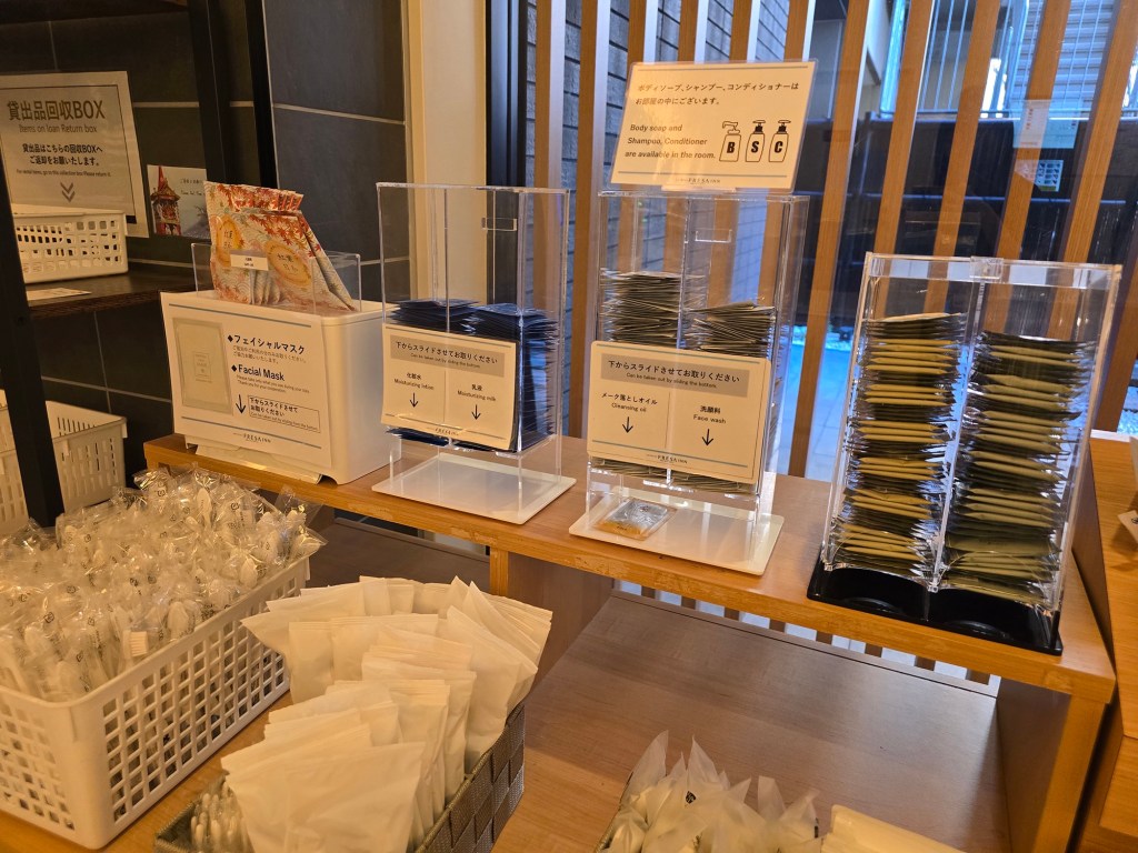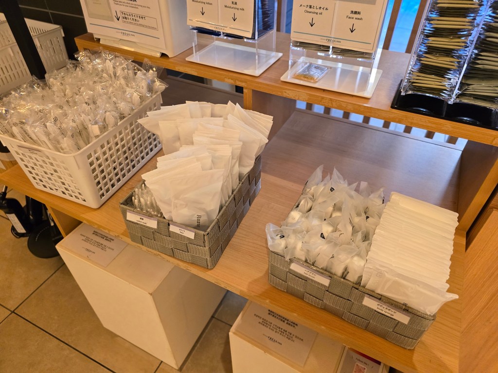 There are many other bathroom/self-care amenities that can be taken from the amenities shelf in the lobby. This includes dental kits, shavers, sachets of lotion/hair essence/skincare/sunscreen, body sponges, hair ties, hair brushes, coffee & tea, etc! Pajamas are also available in the shelf next to the elevator (no they’re not provided in the rooms itself).