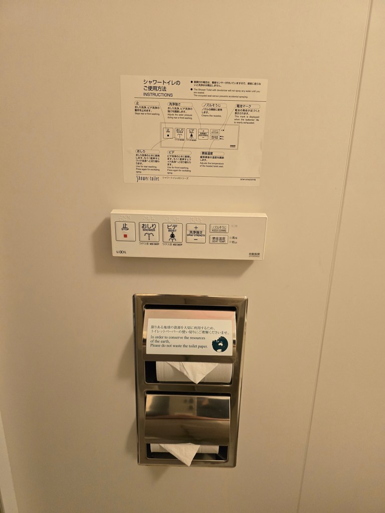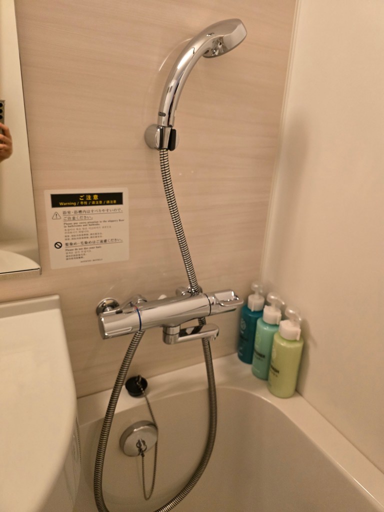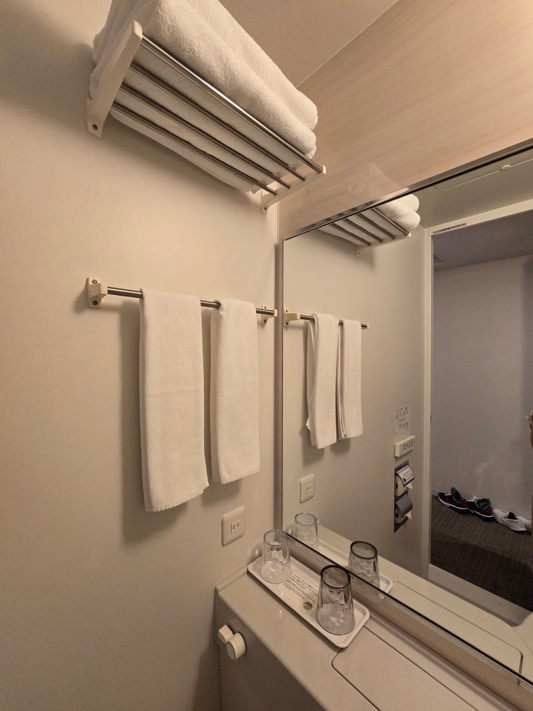 A standard Japanese unit bathroom, with a washlet (with seat warmer!!), a small bathtub with handheld shower and very good water pressure (and drainage), and a small sink. Bathroom amenities are not provided in here since what you require can be taken from the lobby (see my section on the amenities in the lobby). There are two of each of the following provided: cups, hand towels, and bath towels. Twin hooks can be found behind the door.