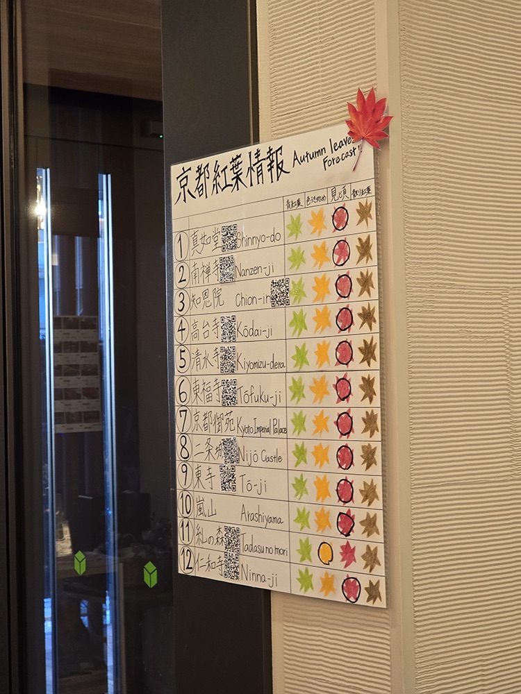 They also had a lot of information stuck on the walls while we were there – such as the day’s weather forecast and autumn foliage forecasts in various locations in Kyoto! Brochures and their very own leaflets with nearby food recommendations are also available!
