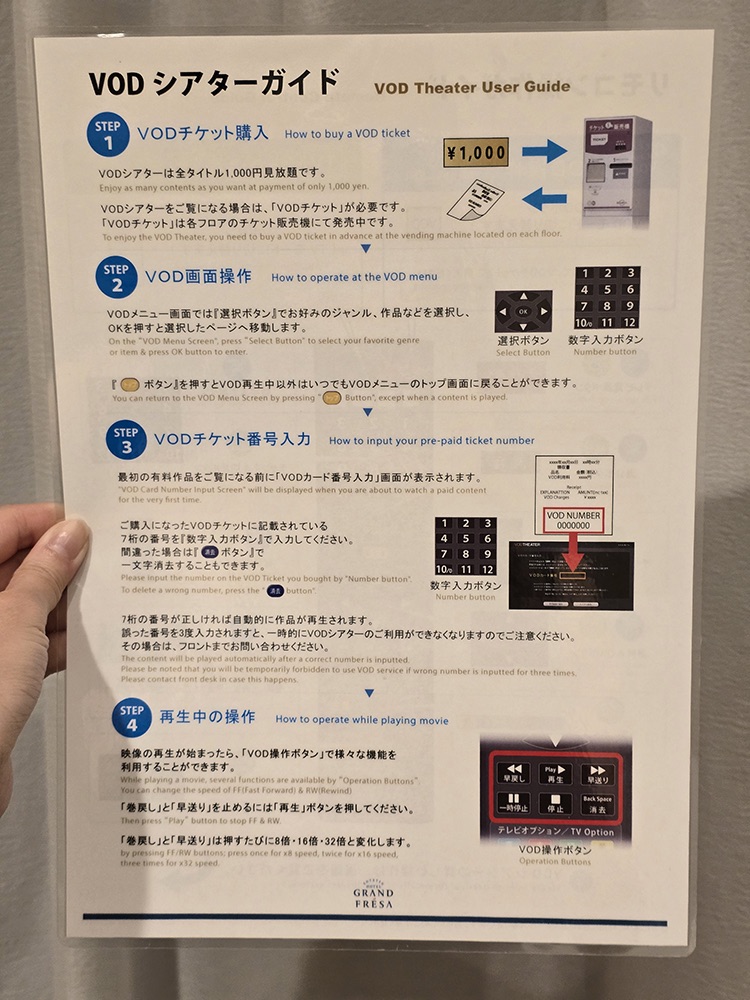 A hairdryer and a foldable desk mirror are also provided in the room (located in the drawer of the desk). VOD tickets can be purchased at your room’s lift lobby, which is also where the trouser press can be found.