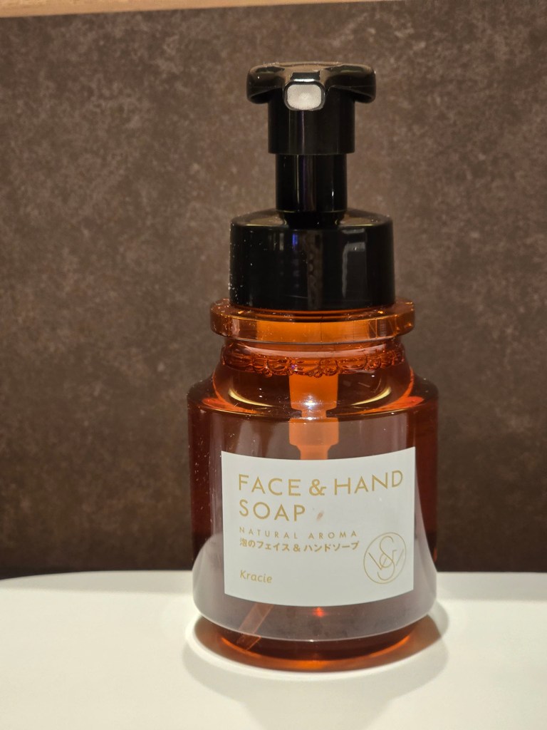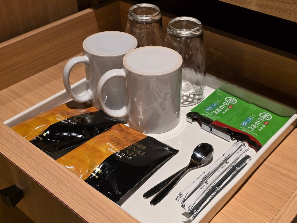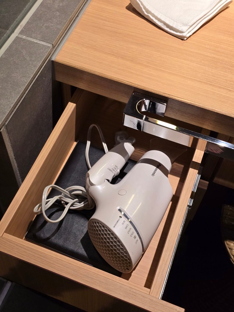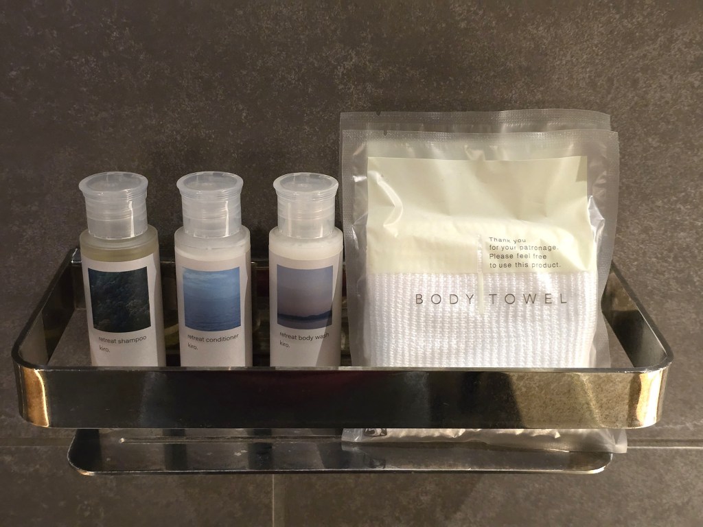 For the bathroom amenities, small bottles of soap, shampoo and conditioner can be found in the bath area, along with a body towel (not body sponge like most mid-range Japanese hotels have, but a body towel instead!). At the sink, you can find a cute little pouch of skincare products, and in the drawer would be the hairdryer and foldable desk mirror.