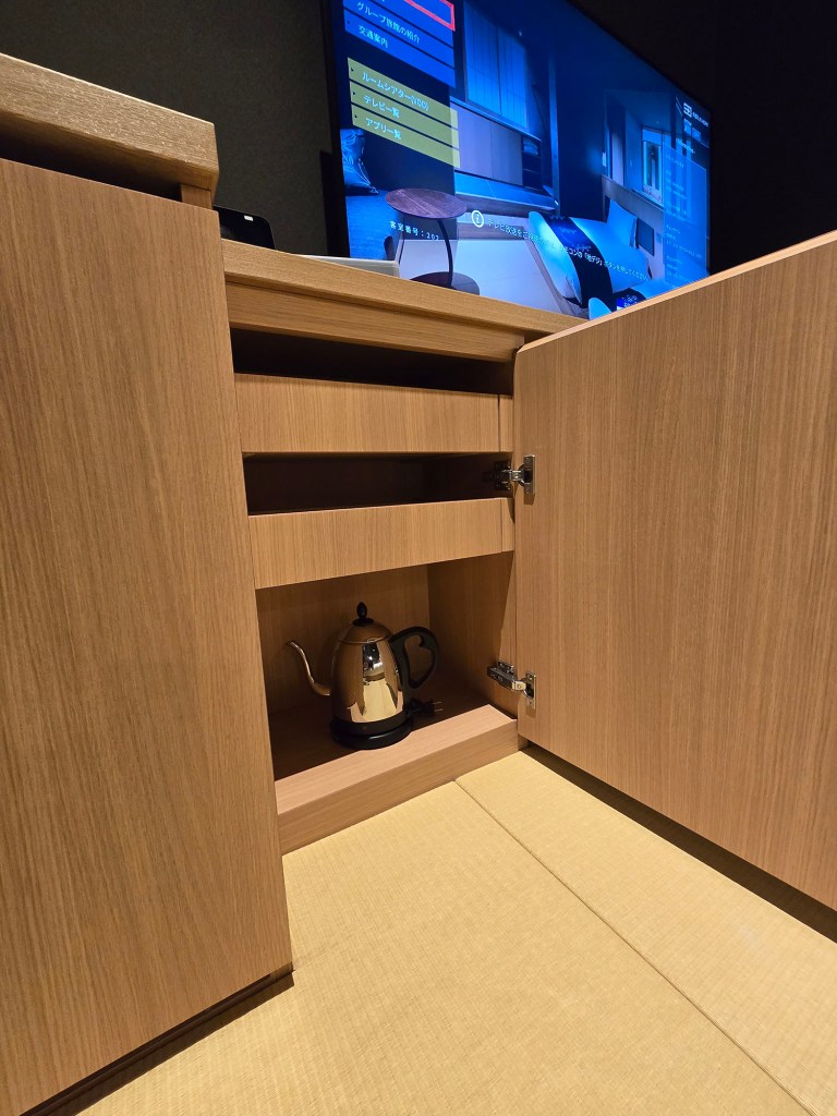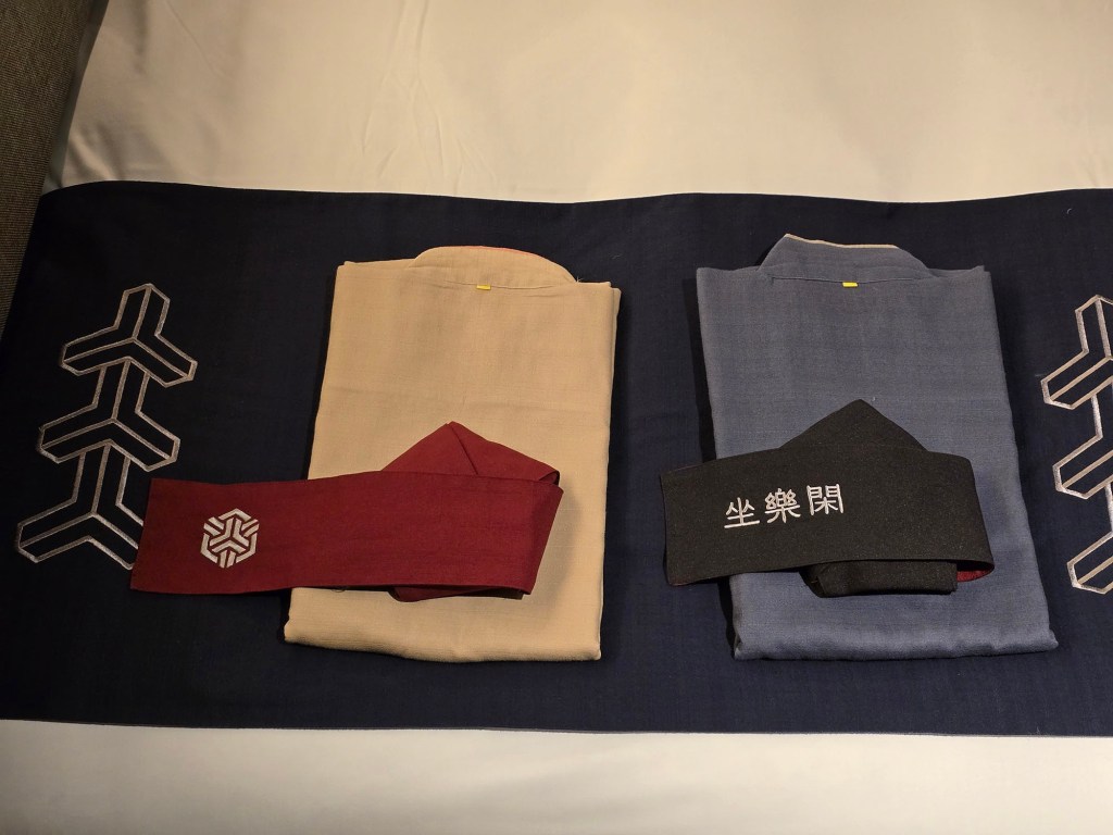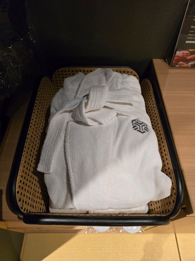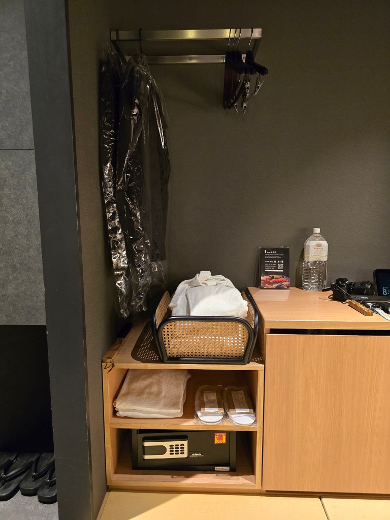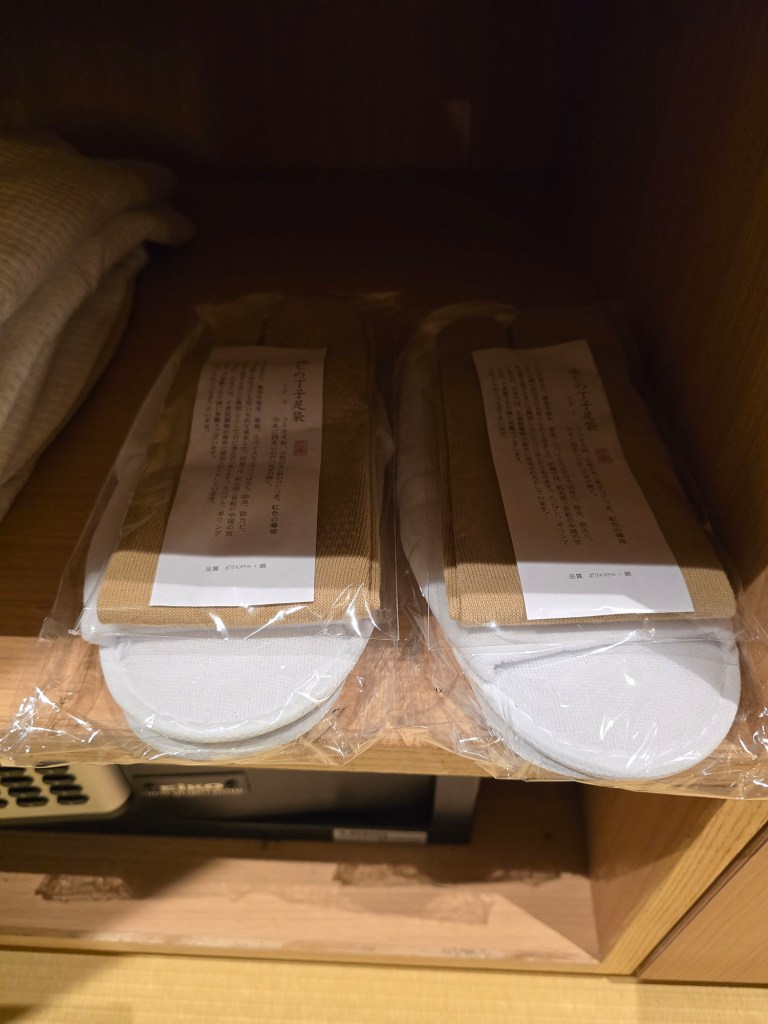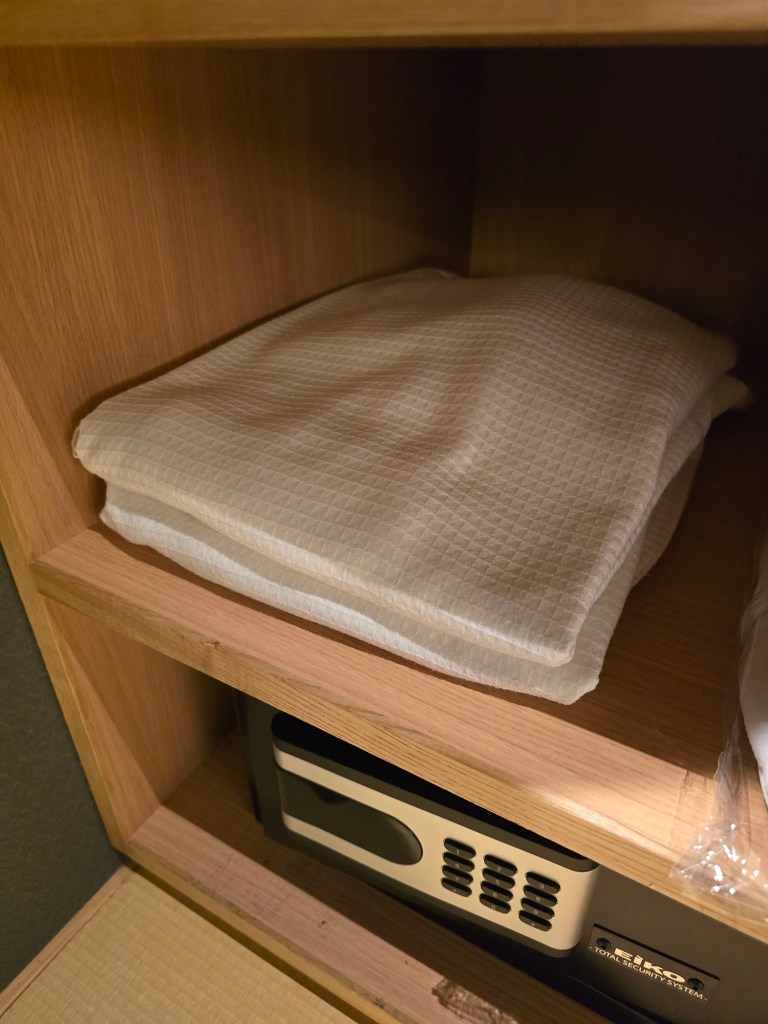 So other than the 2 sets of yukata provided which can be found on the bed (as shown in an earlier section of this page), near the door and where the hangers are for your clothes, you’ll find bedroom slippers, 2 sets of haori (like a coat to wear over your yukata), 2 sets of obi, 2 sets of tabi socks, 2 sets of bathrobes, and 2 sets of pyjamas! (Told ya the list was long 😝)