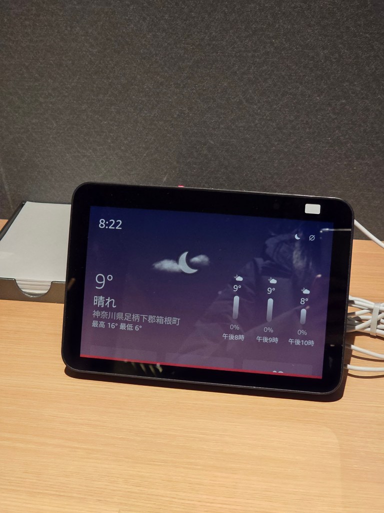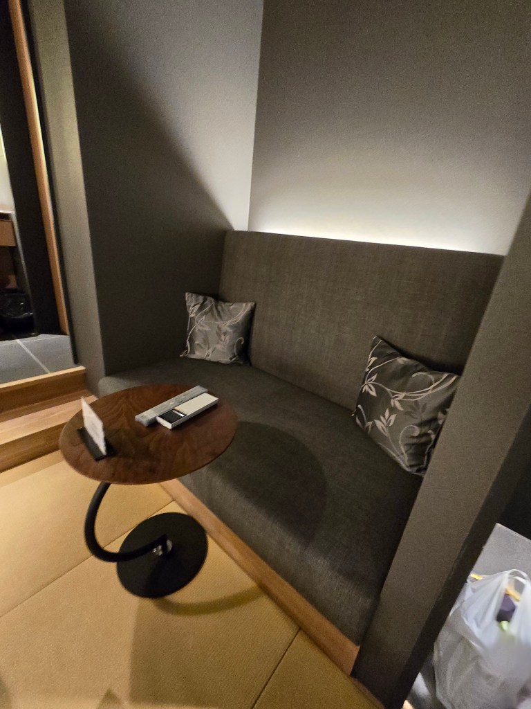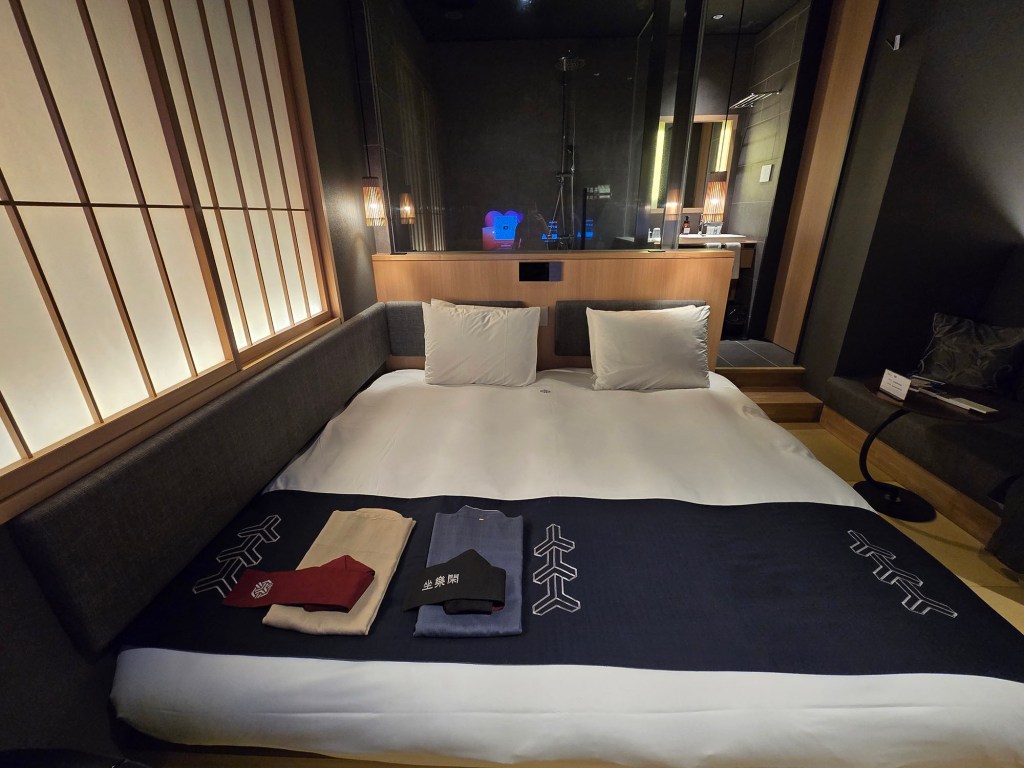 So there’s of course our double bed (according to Agoda, it’s a King bed), with 2 sets of yukata provided (more on what’s that about in the Amenities section of this post because this hotel had provided so much that I was trying out for the first time 😆 but yes they did provide pyjamas too). If you take a close look at the photos, you’ll see there’s this device on the wall behind the bed – that’s where you can control all the lights from – with presets to use too! You can also see the time and weather from there!